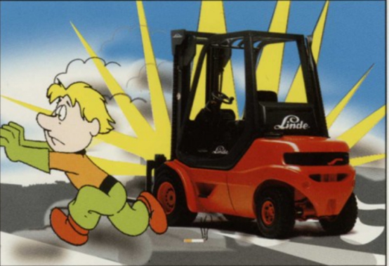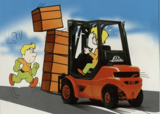 不允許任何人站在或經(jīng)過提升起的貨叉下,也不允許直接站在叉車后部或在叉車轉(zhuǎn)彎時(shí)位于后部回旋區(qū)內(nèi)。