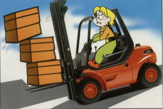 可能會出現(xiàn)在裝載或卸載聯(lián)合操作時(shí)速度快并且轉(zhuǎn)彎迅猛。必須在轉(zhuǎn)彎前減速!如果門架升起,叉車快速轉(zhuǎn)彎,或者加速前進(jìn)并轉(zhuǎn)向或者在斜坡上轉(zhuǎn)向,都可能會引起橫向傾翻。在行駛時(shí)必須降下門架!如果過載、過分前傾或貨物重心偏離都存在橫向傾翻的危險(xiǎn)。